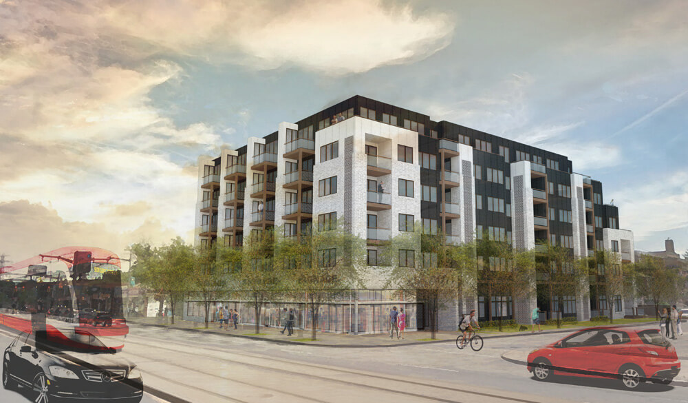 This 72 unit residential project with retail on the ground floor includes the principles of urban regeneration, livability and sustainable design with equal importance and proposes a new prototype for midrise intensification on main streets. SCOOP condominiums at 1771 St. Clair Avenue West embraces the growing appreciation for mid rise buildings in the City of Toronto and the recent change in the Ontario Building Code allowing six storey wood construction as the building utilizes timber framing as its structural system.