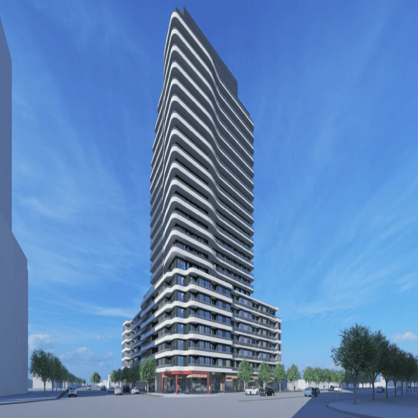 mixed-use building with a 7-storey podium and it includes three levels of underground parking.